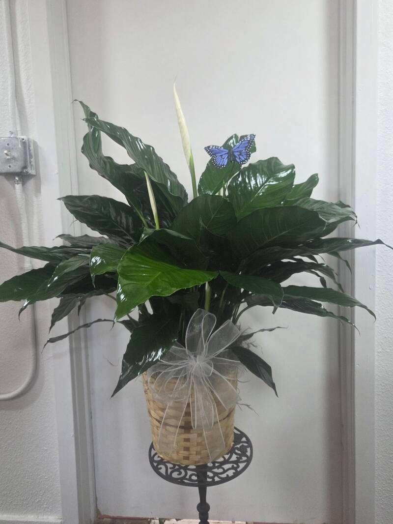 This week, I completed my final funeral delivery to La Vernia. Several local business owners placed orders with one local business owner, who shared a touching story with me. The wife of the deceased reminisced about how her husband cherished visiting her store for a grape soda. To honor this fond memory, I included a grape soda from her shop in the basket arrangement. The funeral home staff and directors appreciated it for its unique and personal touch for the family. I’ve included pictures of the arrangements sent: two floral displays and a beautifully dressed white peace lily plant, complete with a basket, moss, bow, and a butterfly accent.