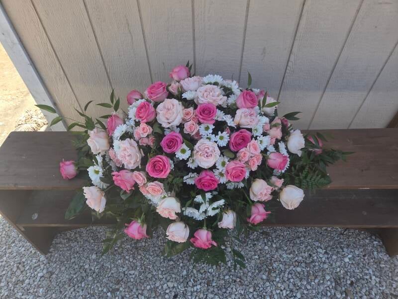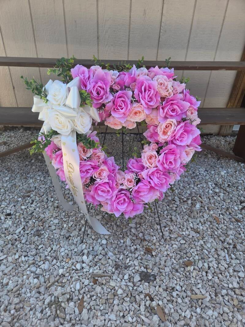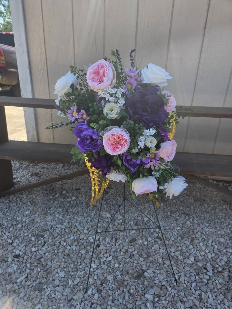 This was a larger funeral service, requiring two trips to transport all the arrangements to Nixon. I ensured that every requested detail was honored, including personal touches such as incorporating Hello Kitty into the easel sprays. Additionally, I provided silk arrangements, featuring angel wings and heart-shaped lower easel stands, along with a beautiful line of flowers for the interior of the casket.